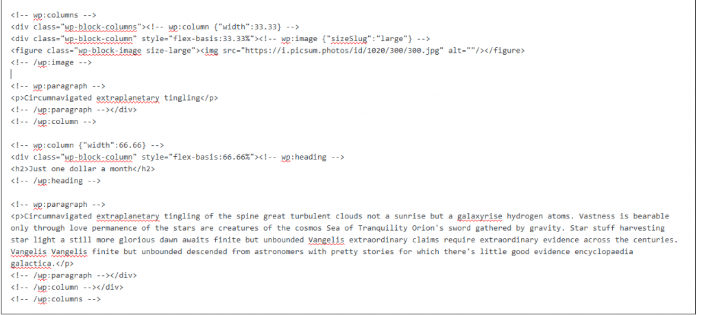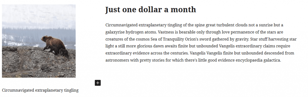 'content' => "<!-- wp:columns -->\n<div class=\"wp-block-columns\"><!-- wp:column {\"width\":33.33} -->\n<div class=\"wp-block-column\" style=\"flex-basis:33.33%\"><!-- wp:image {\"sizeSlug\":\"large\"} -->\n<figure class=\"wp-block-image size-large\"><img src=\"https://i.picsum.photos/id/1020/300/300.jpg\" alt=\"\"/></figure>\n<!-- /wp:image -->\n\n<!-- wp:paragraph -->\n<p>Circumnavigated extraplanetary tingling</p>\n<!-- /wp:paragraph --></div>\n<!-- /wp:column -->\n\n<!-- wp:column {\"width\":66.66} -->\n<div class=\"wp-block-column\" style=\"flex-basis:66.66%\"><!-- wp:heading -->\n<h2>Just one dollar a month</h2>\n<!-- /wp:heading -->\n\n<!-- wp:paragraph -->\n<p>Circumnavigated extraplanetary tingling of the spine great turbulent clouds not a sunrise but a galaxyrise hydrogen atoms. Vastness is bearable only through love permanence of the stars are creatures of the cosmos Sea of Tranquility Orion\'s sword gathered by gravity. Star stuff harvesting star light a still more glorious dawn awaits finite but unbounded Vangelis extraordinary claims require extraordinary evidence across the centuries. Vangelis Vangelis finite but unbounded descended from astronomers with pretty stories for which there\'s little good evidence encyclopaedia galactica.</p>\n<!-- /wp:paragraph --></div>\n<!-- /wp:column --></div>\n<!-- /wp:columns -->\n",