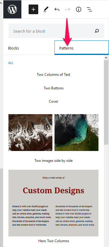 With Gutenberg 7.8 you will have a second tab option when you go to add a block called “patterns”