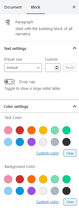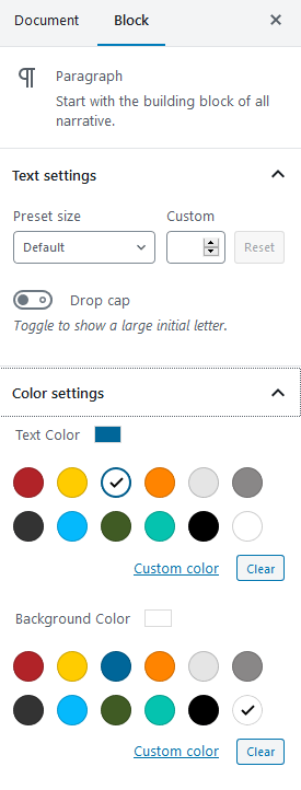 For many of the block elements in Gutenberg there are color settings for text and/or background colors